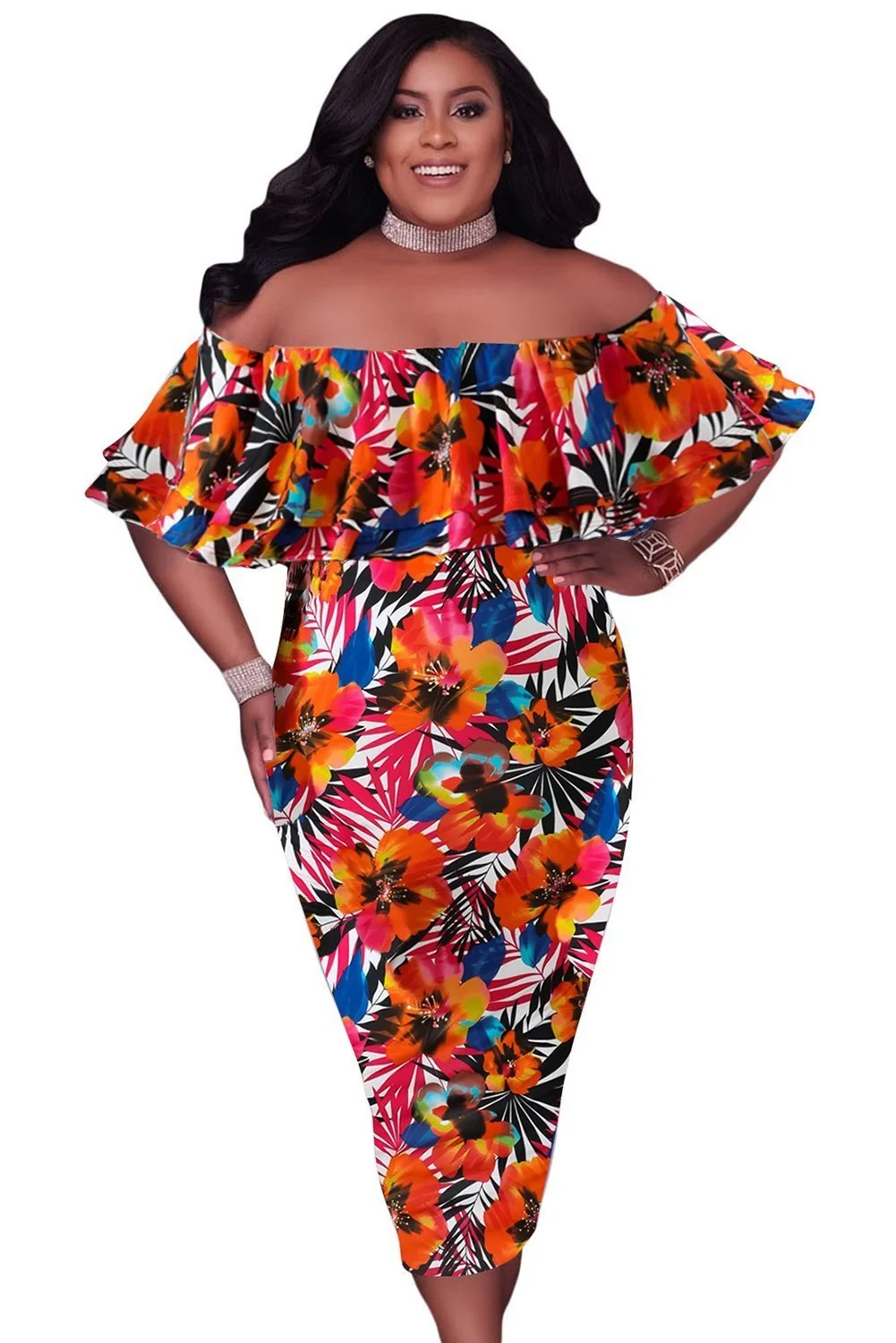 Orange Floral Off Shoulder Party Midi Bodycon Plus Size Dress